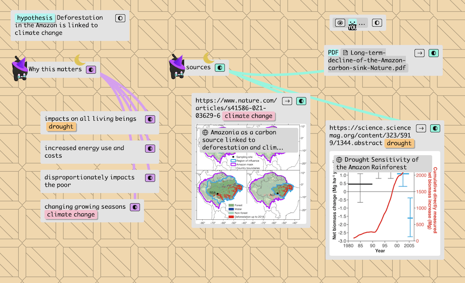 Gather notes, and connect them to their source URLs. Drag in files, like PDFs, to keep everything together. Categorize and label similar concepts with [[tags]].