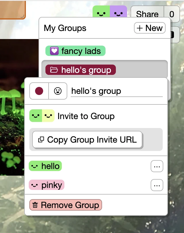 Anyone you share the invite code with will be added to your Group. If they don't yet have a Kinopio account, they'll be added once they sign up.