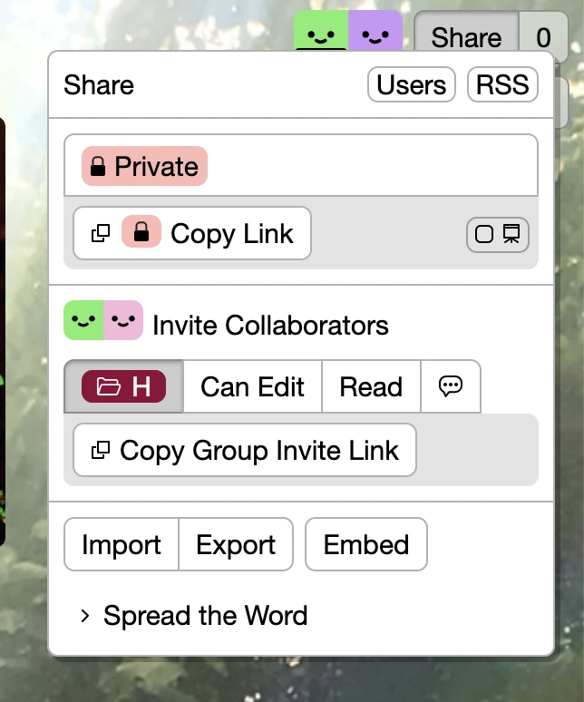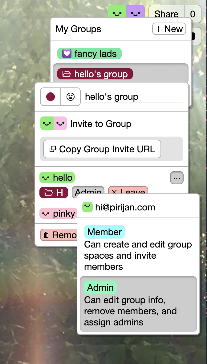 If the current space is in a group, the Share menu will also display the Copy Invite to Group URL button