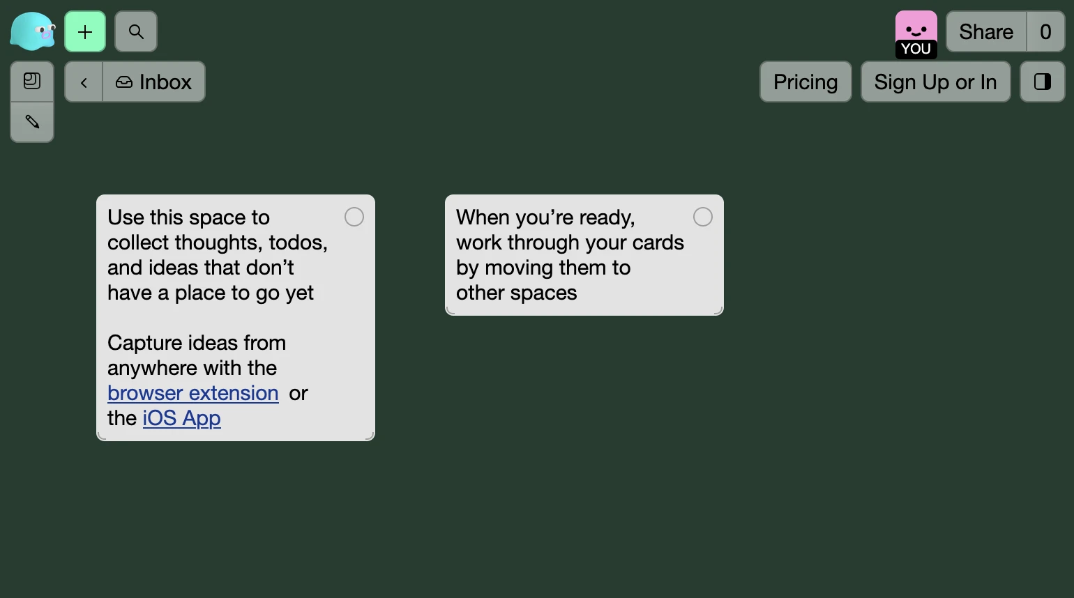 Use an Inbox space to collect thoughts, todos, and ideas that don't have a place to go yet. Your Inbox will appear above all your other spaces and favourites so it's always close at hand