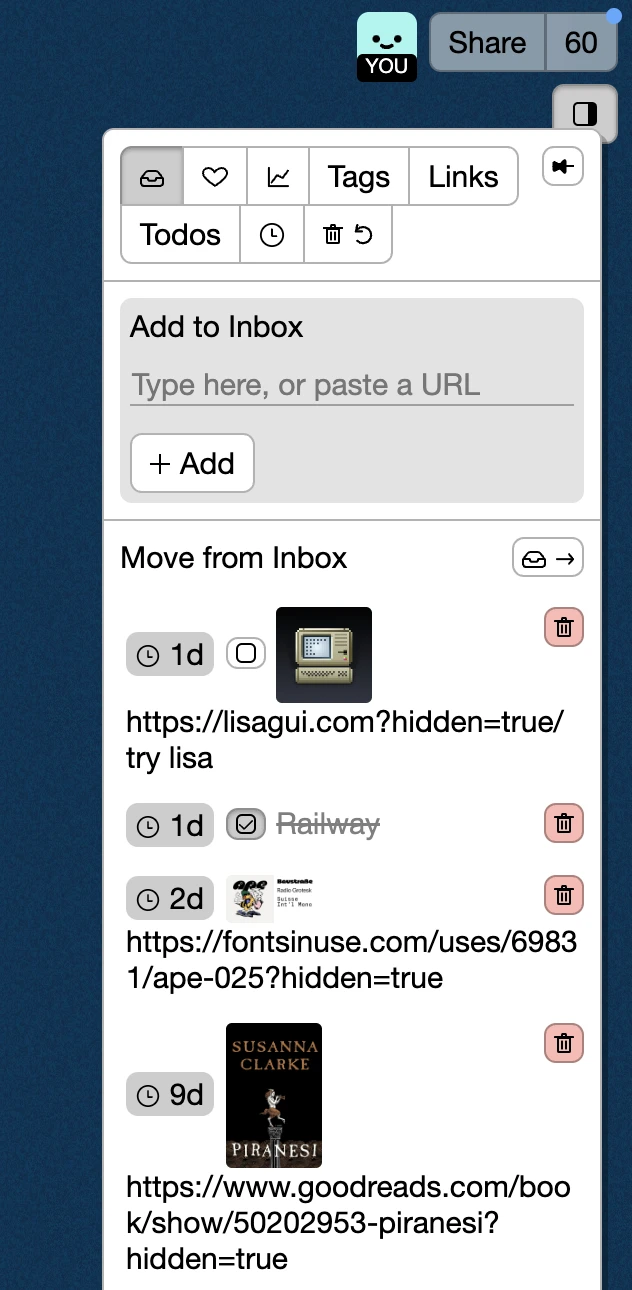 Add anything to your inbox on the go with the Kinopio browser extensions, or through the system share sheet if you have the iOS app installed