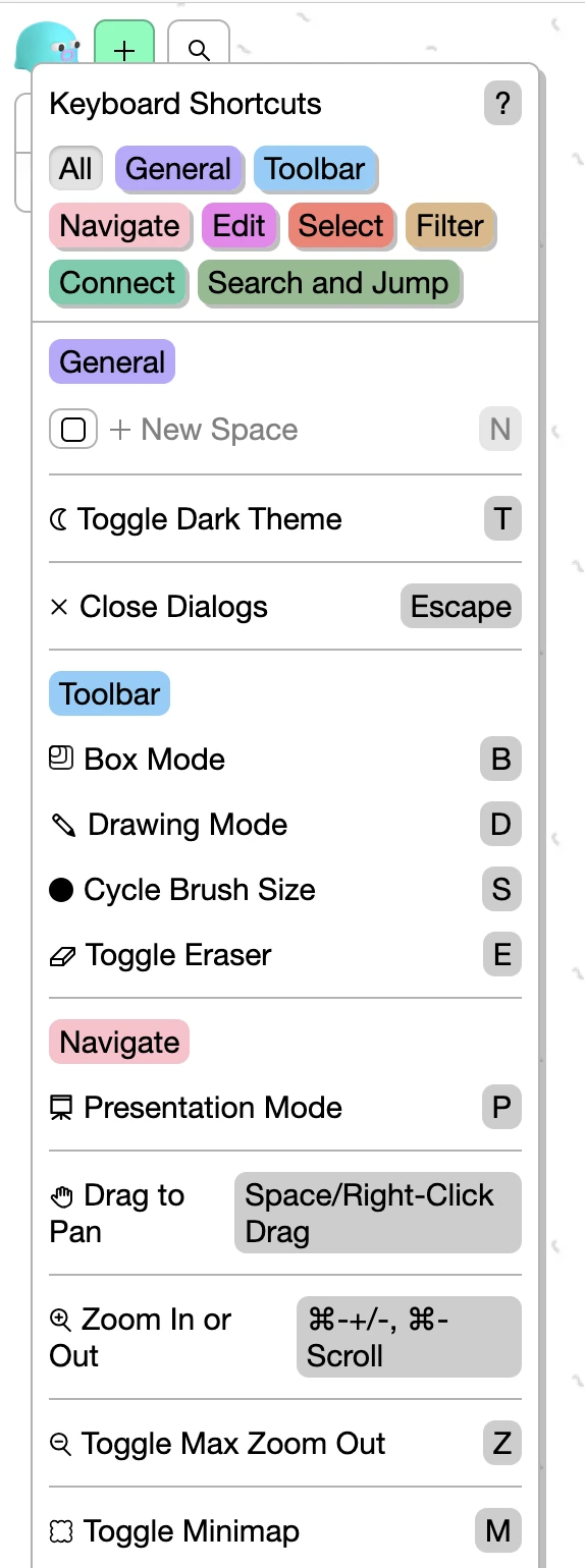 You can find a complete list of keyboard shortcuts in About → Keyboard Shortcuts. Or quick access them by pressing ? while not focused on anything else.